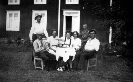 Fr.v: Alfred Bertholm (DaLi Alfri), stående okänd, Vivi Bertholm (DaLI Viivi),okänd, okänd, Matilda Bertholm (DaLi Tilda), okänd. Foto taget vid hus nr. 186 A.