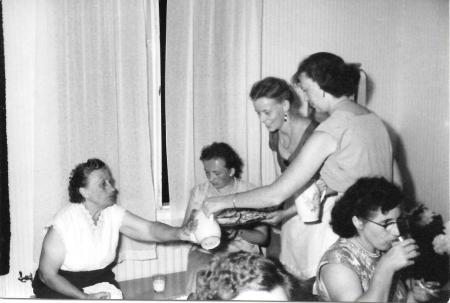 Fr.v: Ida Nygård (Båtos Iida), Gladys M Nygård g. Burman (Härrgos Gleedes), Okänd, Okänd Vivi Burman g. Björk (Smedis Viivi).