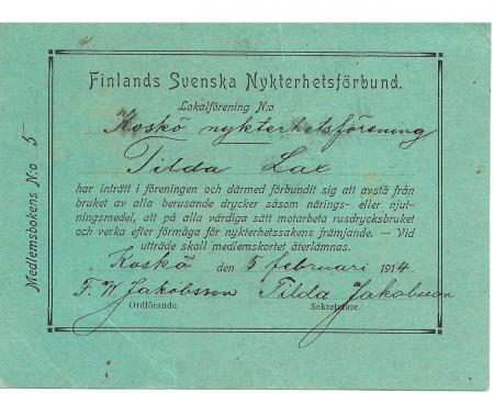 Koskö Nykterhetsförening medlemskort 2
