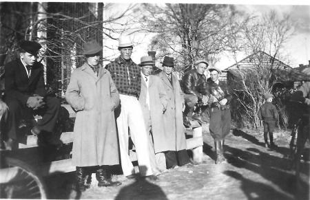 Fr.v: Okänd, Arvid Burman (Aabrams Arvid), Knut Nygård (Nyygos Knuut), Gunnar Mörk (Mörkkas Gonnar), Okänd, Artur Nygård (Lillis Aartor), Edvin Frants (Lillsto Iedvin).
