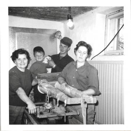 Pälsning av mink, fr.v: Gladys A Burman, Bjarne Krus, Kurt Burman, Siri Snickars.