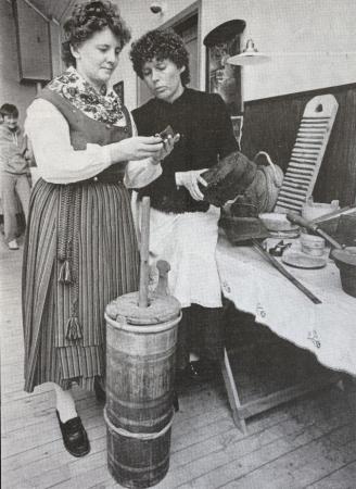 Utställningen "Kvinnors konst" i Koskö samlingshus, ordnad av hembygdsforskarna till Mors Dag 1983 med Lisen Jåfs och Gunne lax som som ansvarspersoner.