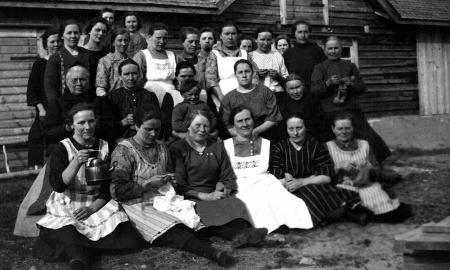 Fr.v. i den delvis dubbla översta raden: Edit Burman (Karoliinas Marios Iedit), Anna Bergendahl (Maalaks Anna), Signe Nygård (Åskaras Singni), Helga Burman (Bekkmans Helga), Matilda Bertholm (DaLi Tilda), Agnes Nygård (Frekkas Angnes), Matilda Burman (Maalaks Tilda), Ida Nygård (Båtos Iida), Elna Frants (Lillsto Elna), Signe Nygård (Iivaras Singni), Gerda Hedqvist (Laksis Jääda), Anna Holm (Laksis Anna), Hellen Burman (Ståosto Hellen), Hilda Frants (Mörkkas Hilda), Johanna Fant (Ståosto Hanna).