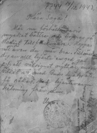 Brevet skrivet 14.12.1941 av pastor Harry Holtti. Uno sårades svårt bl.a i ryggen och kunde inte skriva brev själv.