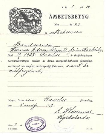 Emigration Edvin Frants ämbetsbetyg